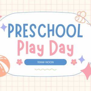 Preschool Play Day is Monday, October 6, 10am-12pm, in the gym for all preschoolers (babies-preK) and a parent. Join us for a morning filled with fun, games, crafts, and friends.