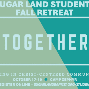 Student Ministry Fall Retreat TOGETHER: Living in Christ-Centered Community October 17-19 at Camp Zephyr in Sandia, TX For all students currently in grades 7-12. Cost is $120 per student. For more info, email Davey Gibson or Rebecca Chappell. Click here to register.