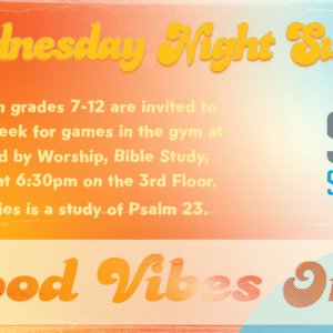 Surge Good Vibes Only – Students in grades 7-12 are invited to join us each Wednesday for games in the gym at 6pm, followed by Worship, Bible Study, and fellowship at 6:30pm on the 3rd floor. Our new series is a study of Psalm 23.