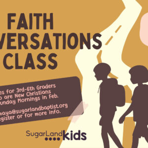 Faith Conversations Class will meet on Sunday mornings from 11:05-12:00 from February 1-23. For four weeks, 3rd-6th grade students will dive into discussion about what it means to follow Christ. This class is designed for children who have recently made a personal decision to follow Christ or are curious about doing so. Email Mindi Maya to register.