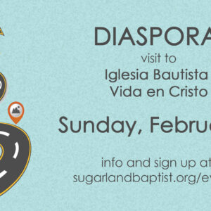 Diaspora visit to Iglesia Bautista Vida en Cristo is Sunday, February 1, 1pm. Meet in the east parking lot at SLBC at 12pm to ride together. Bring your own sack lunch to eat on the way. Click here to RSVP.