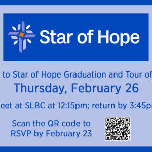 Join us for a visit to Star of Hope’s graduation ceremony and a tour of their facility on Thursday, February 26. Meet at SLBC at 12:15pm to ride together; return around 3:45pm. Click here to sign up by February 23.
