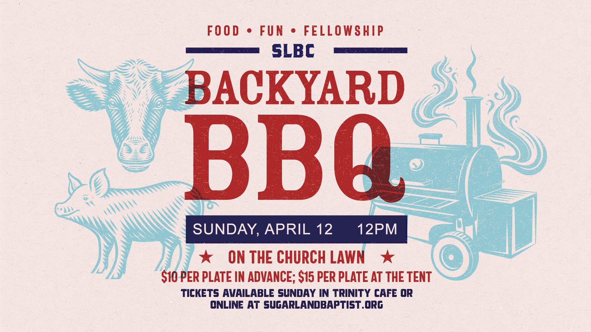 Join the fun, food, and fellowship at our church wide backyard BBQ on Sunday, April 12, outside on the East Lawn following church. Cost is $10 per plate through Friday, April 10, or $15 per plate payable at the tent. Free hotdogs and chips will be available for kids.