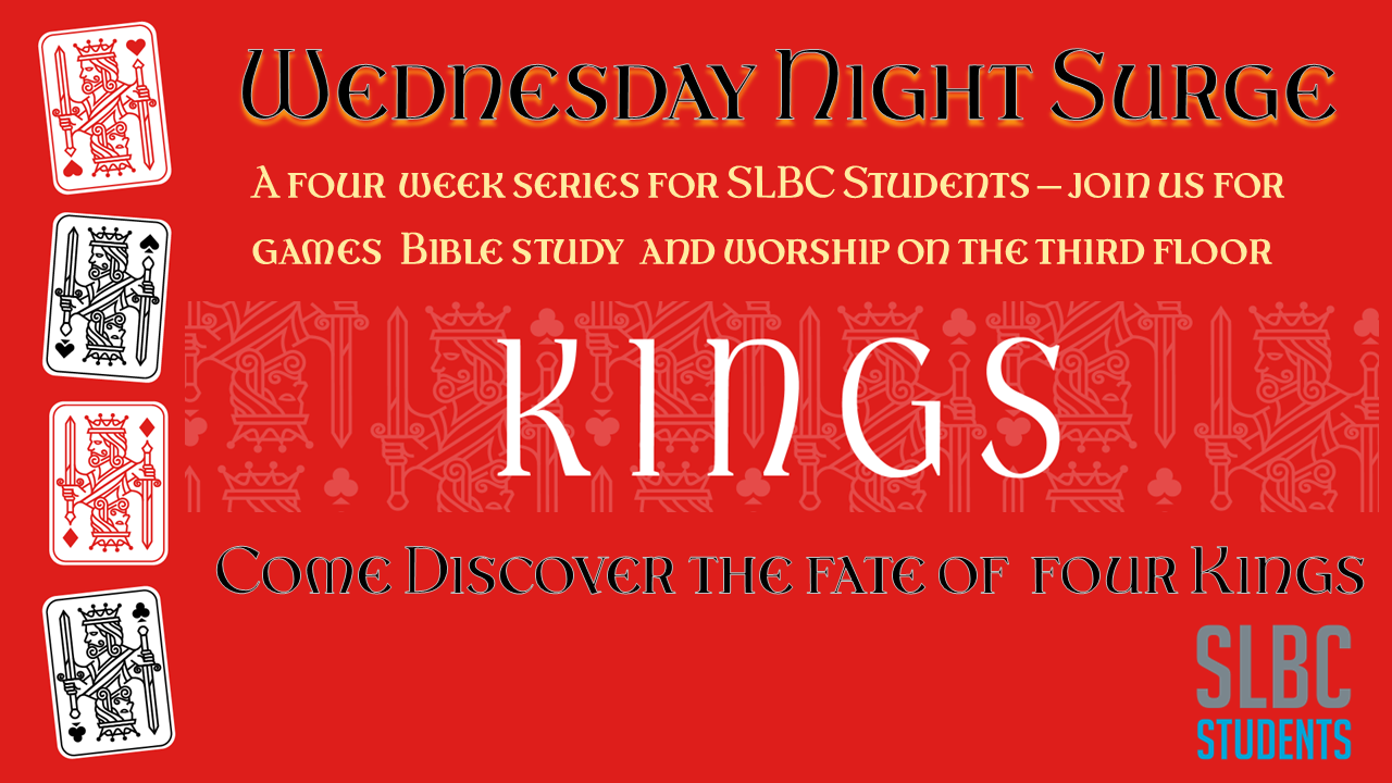 Surge – Students in grades 7-12 are invited to join us each Wednesday for games in the gym at 6pm, followed by Worship, Bible Study, and fellowship at 6:30pm on the 3rd floor.